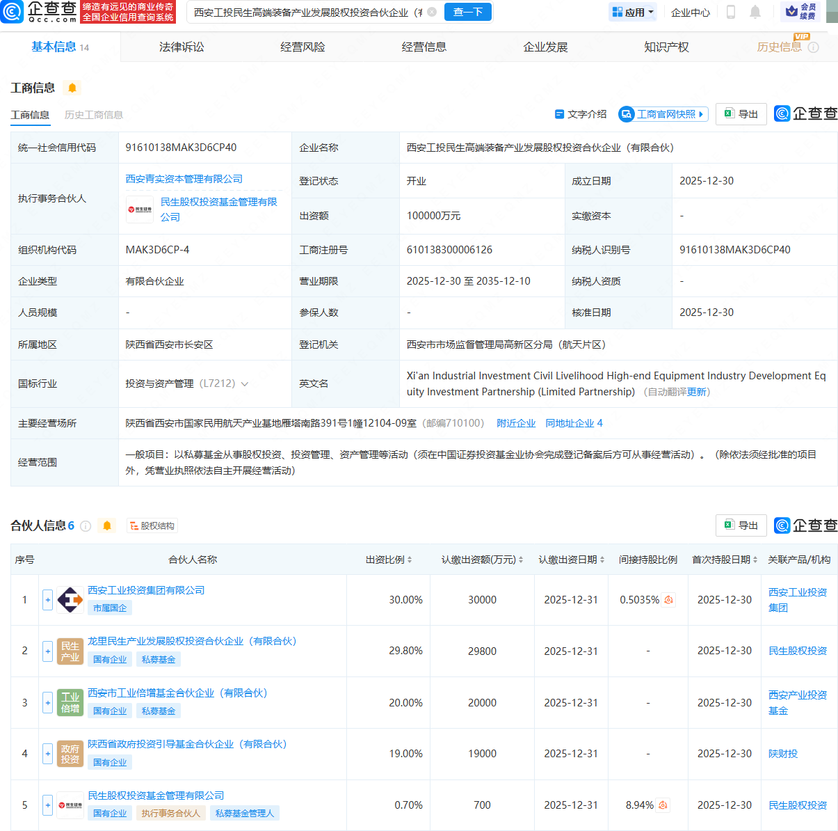 近日,西安工投民生高端装备产业发展股权投资合伙企业(有限合伙)成立,出资额10亿元,经营范围包含:以私募基金从事股权投资、投资管理、资产管理等活动。企查查股权穿透显示,该合伙企业由西安工业投资集团有限公司、龙里民生产业发展股权投资合伙企业(有限合伙)等共同持股。